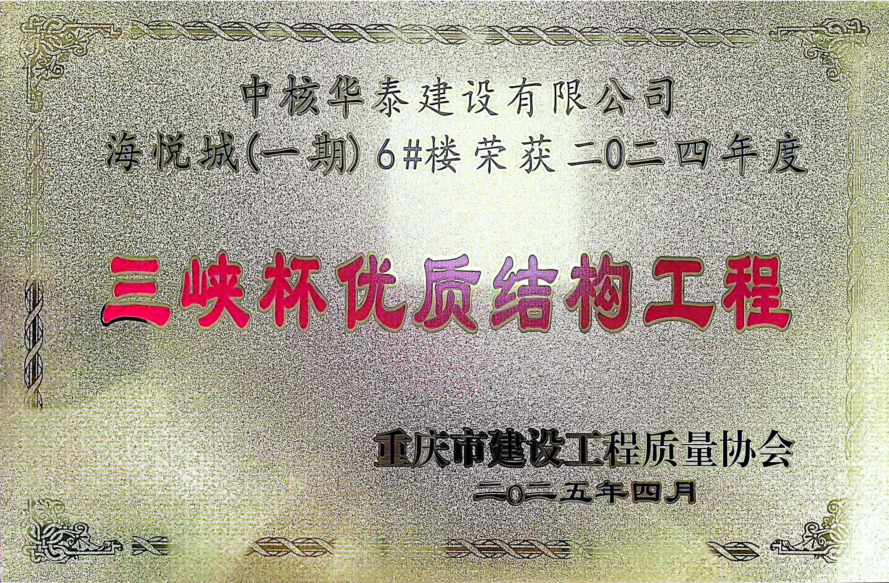 近日,实业公司万州“海悦城”项目6#楼喜获重庆市建设工程质量协会评定的2024年度三峡杯优质结构工程。