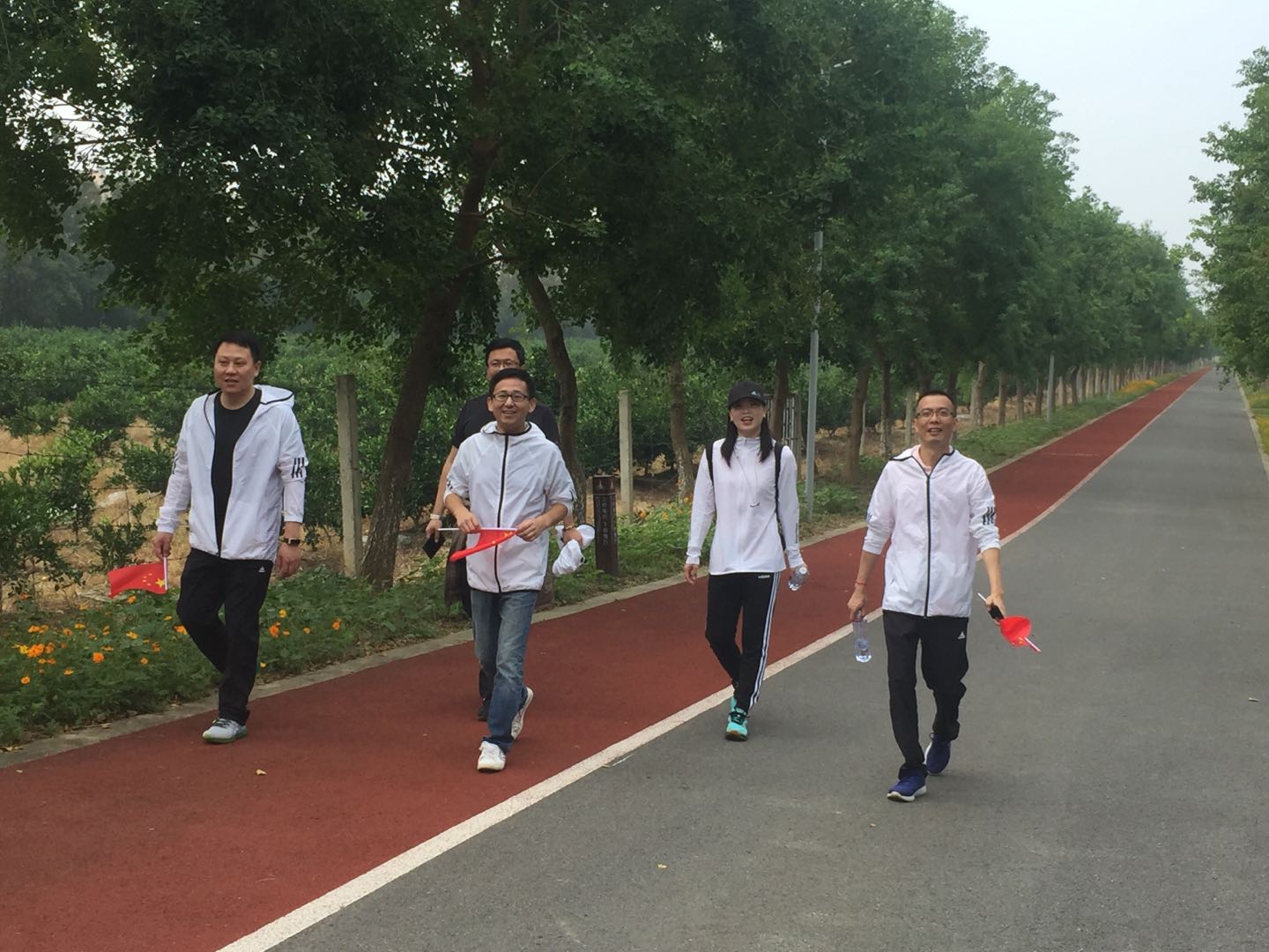 长兴岛郊野公园空气清新,幽静怡人,别具一番景色。在公园健身道上,参加活动的人轻装上阵,手举红旗,个个精神饱满,大家健步如飞,奋力前行;有的三五结伴,共享美景;有的倾心交流,畅谈趣闻,参加活动的人像一个大家庭一样簇拥在一起。一路欣赏着桔树园、玫瑰园、热带水果园,一路呼吸着清新的空气,享受着健步走带来的快乐。经过一个半小时的行程,参加活动的所有人员都抵达了终点。