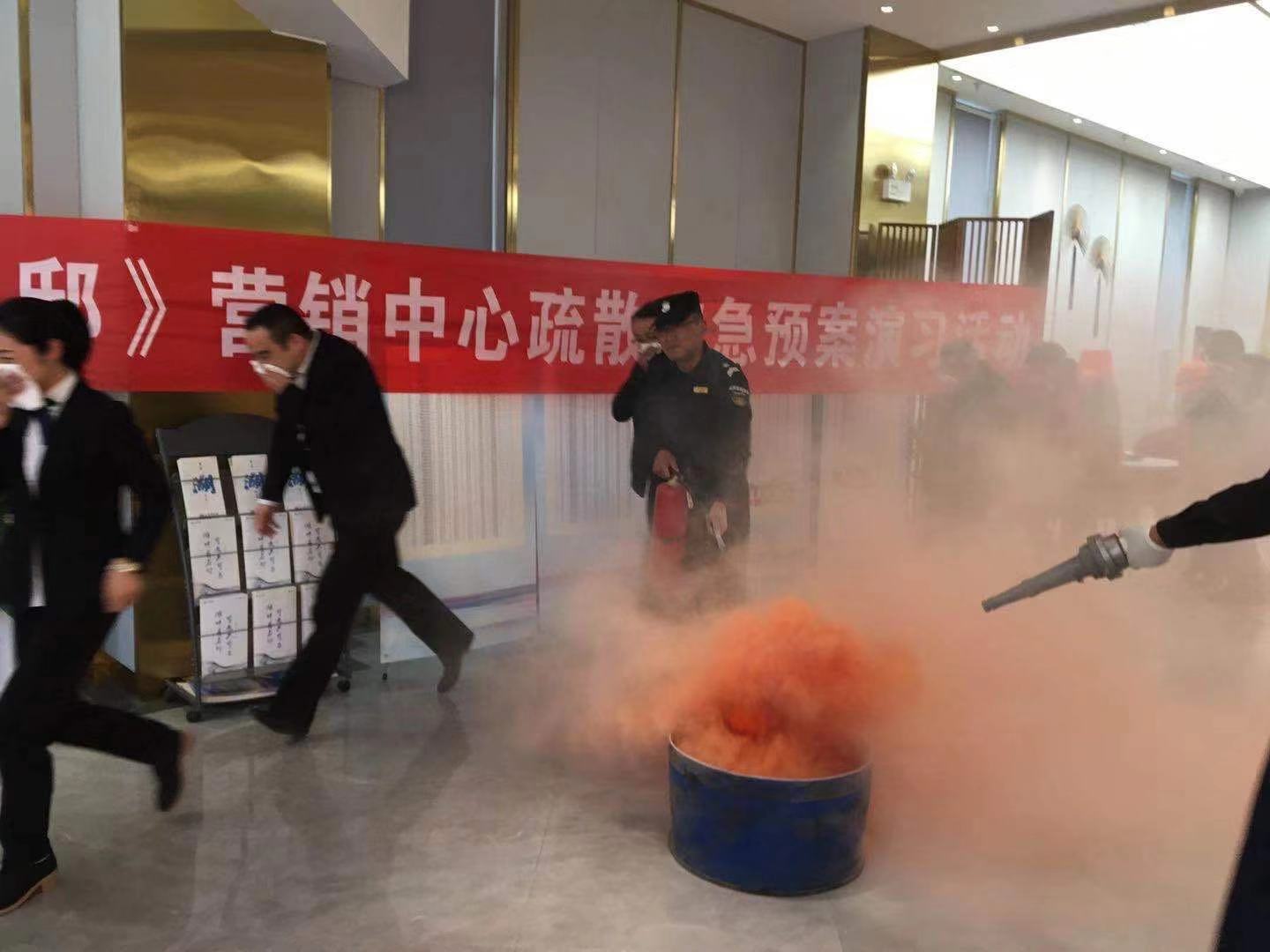 下午两点,演习正式开始,随着烟雾弹的投放,现场浓烟蔓延,参与演习的所有人员用湿毛巾捂住口鼻,弯腰,安全迅速有序的从应急疏散通道跑出售楼部,到达指定应急集合点。