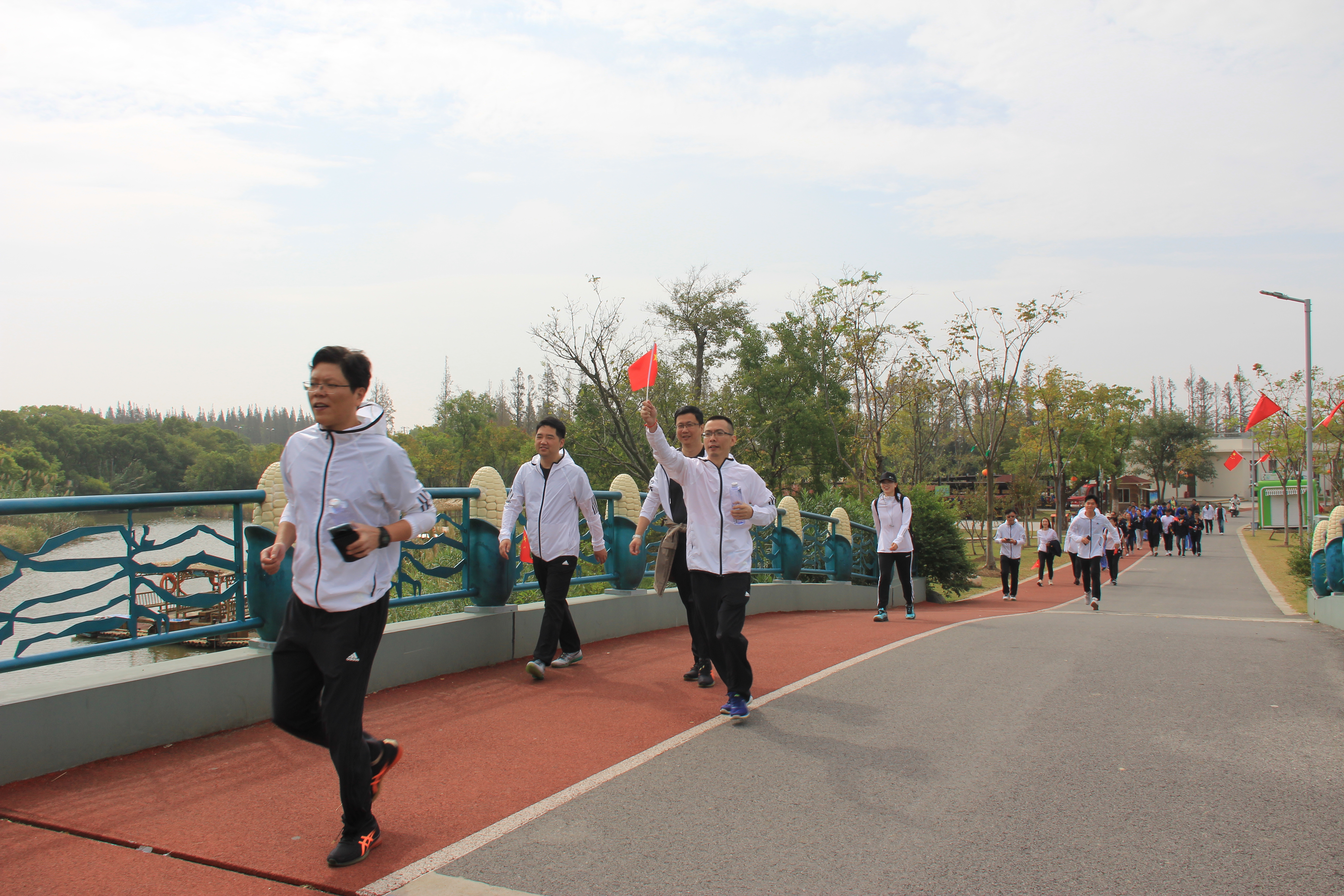 长兴岛郊野公园空气清新,幽静怡人,别具一番景色。在公园健身道上,参加活动的人轻装上阵,手举红旗,个个精神饱满,大家健步如飞,奋力前行;有的三五结伴,共享美景;有的倾心交流,畅谈趣闻,参加活动的人像一个大家庭一样簇拥在一起。一路欣赏着桔树园、玫瑰园、热带水果园,一路呼吸着清新的空气,享受着健步走带来的快乐。经过一个半小时的行程,参加活动的所有人员都抵达了终点。