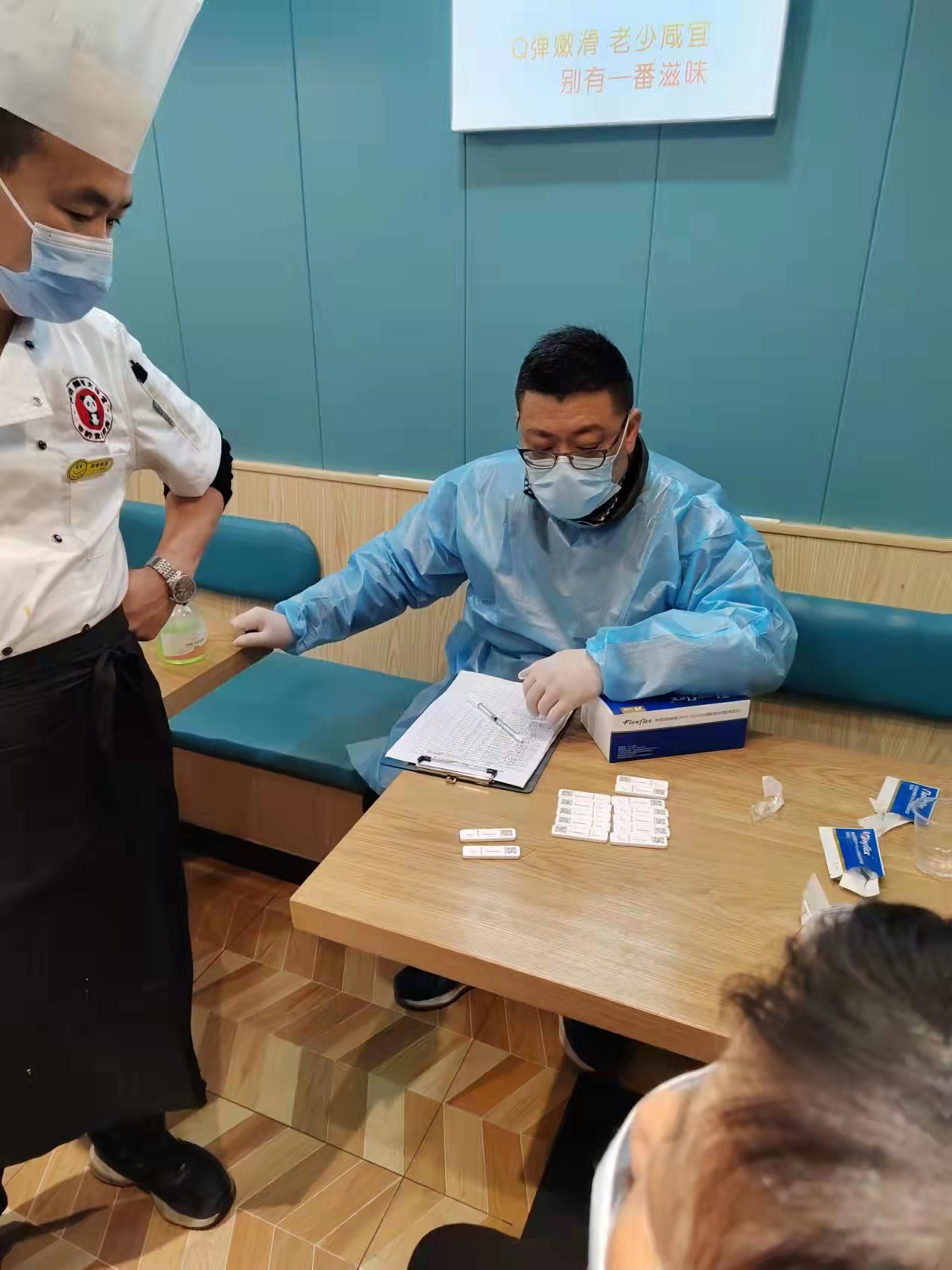 综合管理部职工刘鸿珠听说居委急需志愿者分发抗原试剂,顾不上吃饭直接去居委会报到,在接受培训后,立即向居民发放抗原试剂并指导不会操作手机的居民完成检测并将结果上报,圆满完成任务。