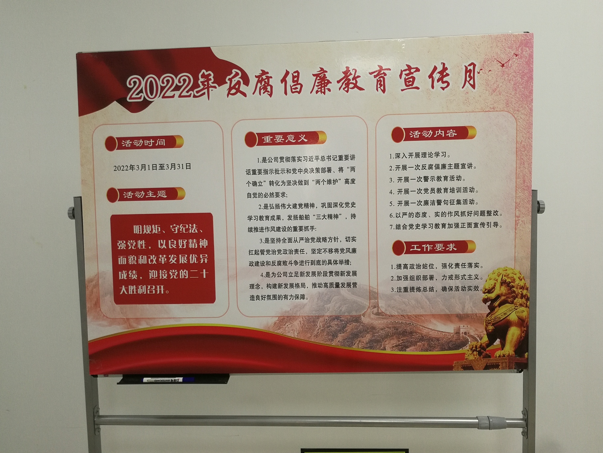 为配合疫情防控工作,实业公司党委紧扣主题,以线上线下等方式深入开展反腐倡廉教育宣传月活动。加强组织领导,印发反腐倡廉教育宣传月活动方案;深入开展理论学习,通过中心组学习、第一议题、党支部“三会一课”等形式组织党员干部线上线下集中学习及个人自学;领导班子成员以视频形式在联系点单位或组织关系所在党支部开展反腐倡廉主题党课;各党支部组织全体党员干部以线下集中或线上视频等形式观看电视专题片《零容忍》、开展党章党规知识答题和廉洁警句征集;开展以案促改监督检查,进一步补短板、强弱项;制作张贴宣传月活动展板;加强正面宣传引导,不断增强宣传教育成效,为高质量发展营造风清气正的良好氛围。