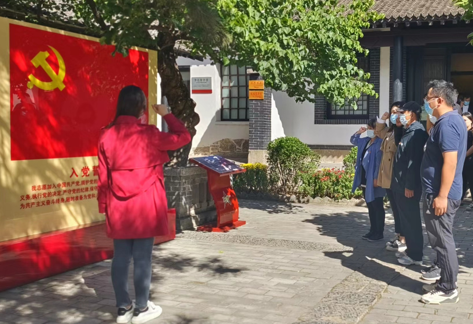 在司令部旧址内,在刘伯承、邓小平同志亲手栽植的丁香树和紫荆树下,面对鲜红的党旗,全体党员举起右手庄严地重温入党誓词,感受“不怕困难、不怕牺牲,勇于担当、勇于胜利”的一二九师精神。